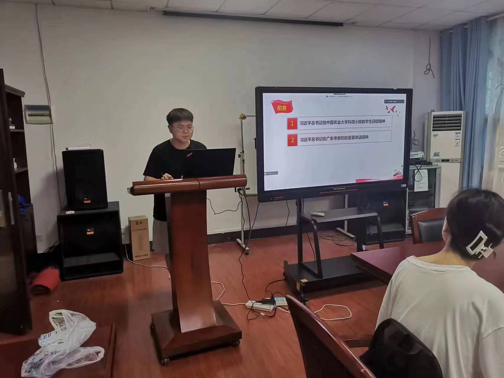 孙家骜同学带领大家学习了习近平总书记给中国农业大学科技小院的学生重要回信精神、习近平总书记在广东考察时的主要讲话精神,他从科技小院的成立背景着重展开,分析习近平总书记在信中对青年大学生的殷切嘱托,提出:青年大学生要更有冲劲与热情,夯实专业基础知识,在逐步地自我提升中,为全面建设社会主义现代化国家贡献青春力量。广大青年要扎根基层、砥砺品格、艰苦奋斗,将个人理想融入中华民族伟大复兴的征程中,在祖国和人民最需要的地方建功立业。