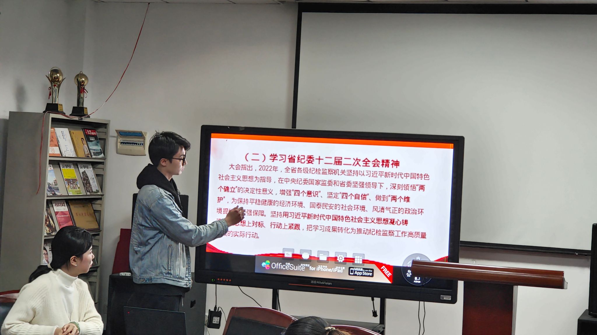 随后,郝金川同学带领同学们学习了2023年全国教育工作会议精神,会议强调要深入推动习近平新时代中国特色社会主义思想和党的二十大精神进教材进课堂进头脑,推动立德树人根本任务取得新的重要进展,加快建立健全促进学生身心健康、持续办好更加公平、更高质量的基础教育。学习省纪委十二届二次全会精神要坚持以习近平新时代中国特色社会主义思想为指导,在中央纪委国家监委和省委坚强领导下,深刻领悟“两个确立”的决定性意义,增强“四个意识”、坚定“四个自信”、做到“两个维护”,为保持平稳健康的经济环境、国泰民安的社会环境、风清气正的政治环境提供了坚强保障。