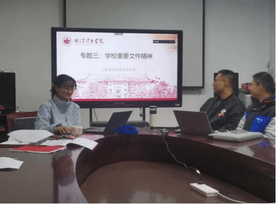 2021级党员王聿森带领大家一起学习了中央、省委重要会议精神。首先学习了2023年全国教育工作会议精神,会议指出,教育系统要坚持从政治上看教育、从民生上抓教育、从规律上办教育,坚决把习近平总书记关于教育的重要论述和重要指示批示有效转化为发展导向、政策举措和工作方法。接下来带领大家学习了中共湖北省第十二届纪律检查委员会第二次全体会议精神,该会议强调要更加紧密地团结在以习近平同志为核心的党中央周围,沿着党的二十大指引的方向,时不我待、只争朝夕,忠诚履职、勇毅前行,努力开创全面从严治党新局面