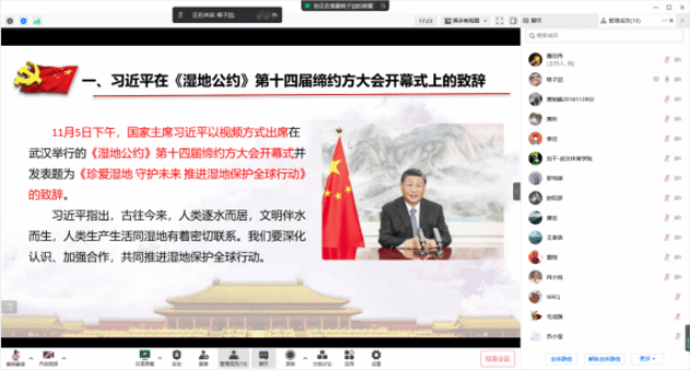 2022级党员杨子喆带领大家学习了习近平新时代中国特色社会主义思想,其中习近平总书记在《湿地公约》第十四届缔约方大会开幕式上的致辞和《习近平生态文明思想学习纲要》提醒全党同志坚持绿水青山就是金山银山,要因地制宜壮大“美丽经济”;坚持良好生态环境是最普惠的民生福祉,着力建设健康宜居美丽家园;坚持绿色发展是发展观的深刻革命,打造国家重大战略绿色发展高地;坚持统筹山水林田湖草沙系统治理,做好生态保护和修复工作;坚持把建设美丽中国转化为全体人民自觉行动,汇聚起强大合力。