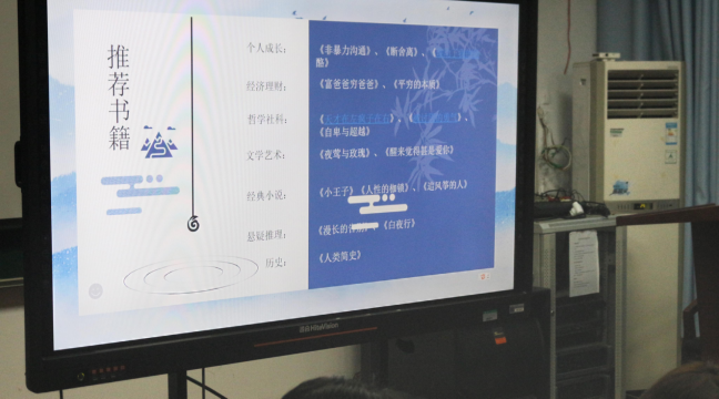 接着王露同学为大家推荐各类书籍,有以下几类:个人成长类、经济理财类、哲学社科类、文学艺术类、经典小说类、悬疑推理类、历史类。其中王同学主要介绍了以下几本书:怎样用沟通和语言技巧来拉近人与人之间关系的《非暴力沟通》、从时间和其他多方面考虑自己与物品的关联性以达到对不必要物品舍弃的《断舍离》、提出目的论的《被讨厌的勇气》以及《自身与超越》和《天才在左疯子在右》等。在王露同学介绍了《为什么精英这样用脑不会累》这本书之后,同学们就这本书中“一个人的合作能力和犯罪几率是否挂钩”这一观点展开了讨论,各抒己见,畅所欲言。